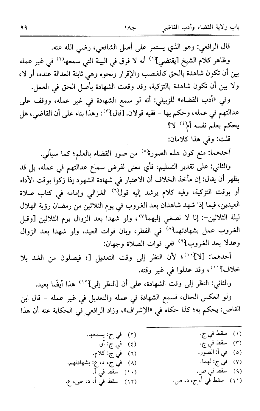 والثاني: على تقدير التسليم، فأي معنى لفرض سماع عدالتهم في عمله، بل قد يظهر أن يقال: إن مأخذ الخلاف أن الاعتبار في شهادة الشهود إذا زكوا بوقت الأداء أو بوقت التزكية، وفيه كلام يرشد إليه قول الغزالي وإمامه في كتاب صلاة العيدين، فيما إذا شهد شاهدان بعد الغروب في يوم الثلاثين من رمضان رؤية الهلال ليلة الثلاثين-: إنا لا نصغي إليهما، ولو شهدا بعد الزوال يوم الثلاثين [وقبل الغروب عمل بشهادتهما في الفطر، وبان فوات العيد، ولو شهدا بعد الزوال وعدلا بعد الغروب] ففي فوات الصلاة وجهان: