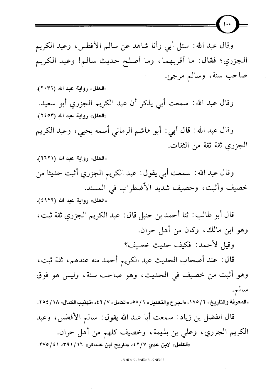وقال عبد اللَّه: سمعت أبي يقول: عبد الكريم الجزري أثبت حديثا من خصيف وأثبت، وخصيف شديد الاضطراب في المسند.