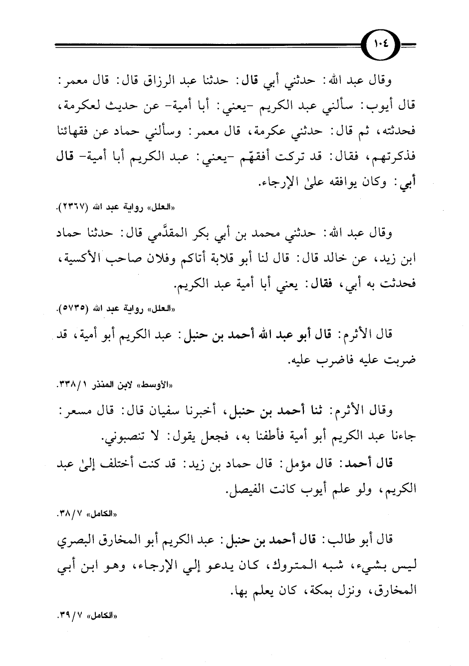 وقال عبد اللَّه: حدثني أبي قال: حدثنا عبد الرزاق قال: قال معمر: قال أيوب: سألني عبد الكريم -يعني: أبا أمية- عن حديث لعكرمة، فحدثته، ثم قال: حدثني عكرمة، قال معمر: وسألني حماد عن فقهائنا فذكرتهم، فقال: قد تركت أفقهّم -يعني: عبد الكريم أبا أمية- قال أبي: وكان يوافقه على الإرجاء.
