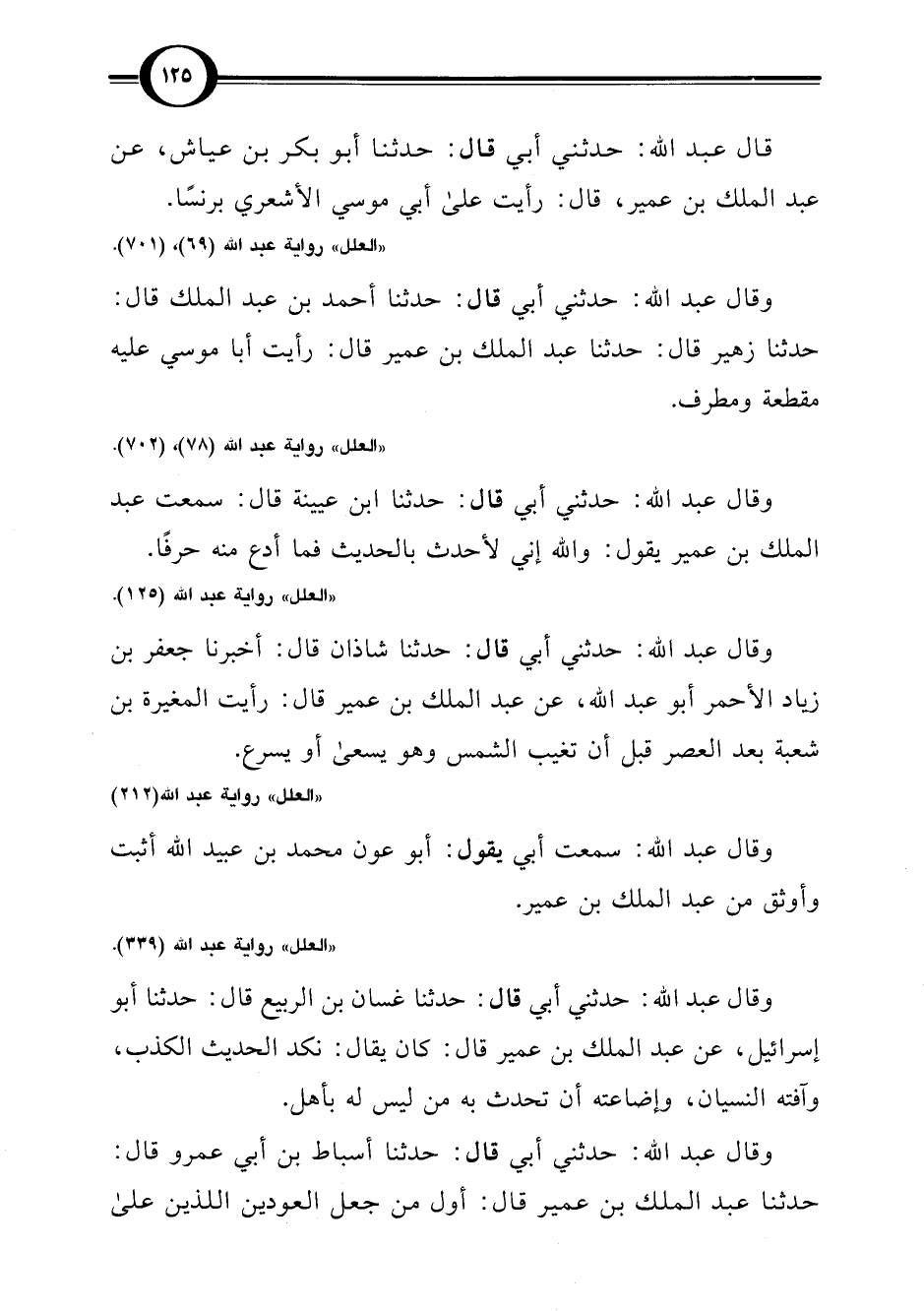 وقال عبد اللَّه: حدثني أبي قال: حدثنا ابن عيينة قال: سمعت عبد الملك بن عمير يقول: واللَّه إني لأحدث بالحديث فما أدع منه حرفًا.