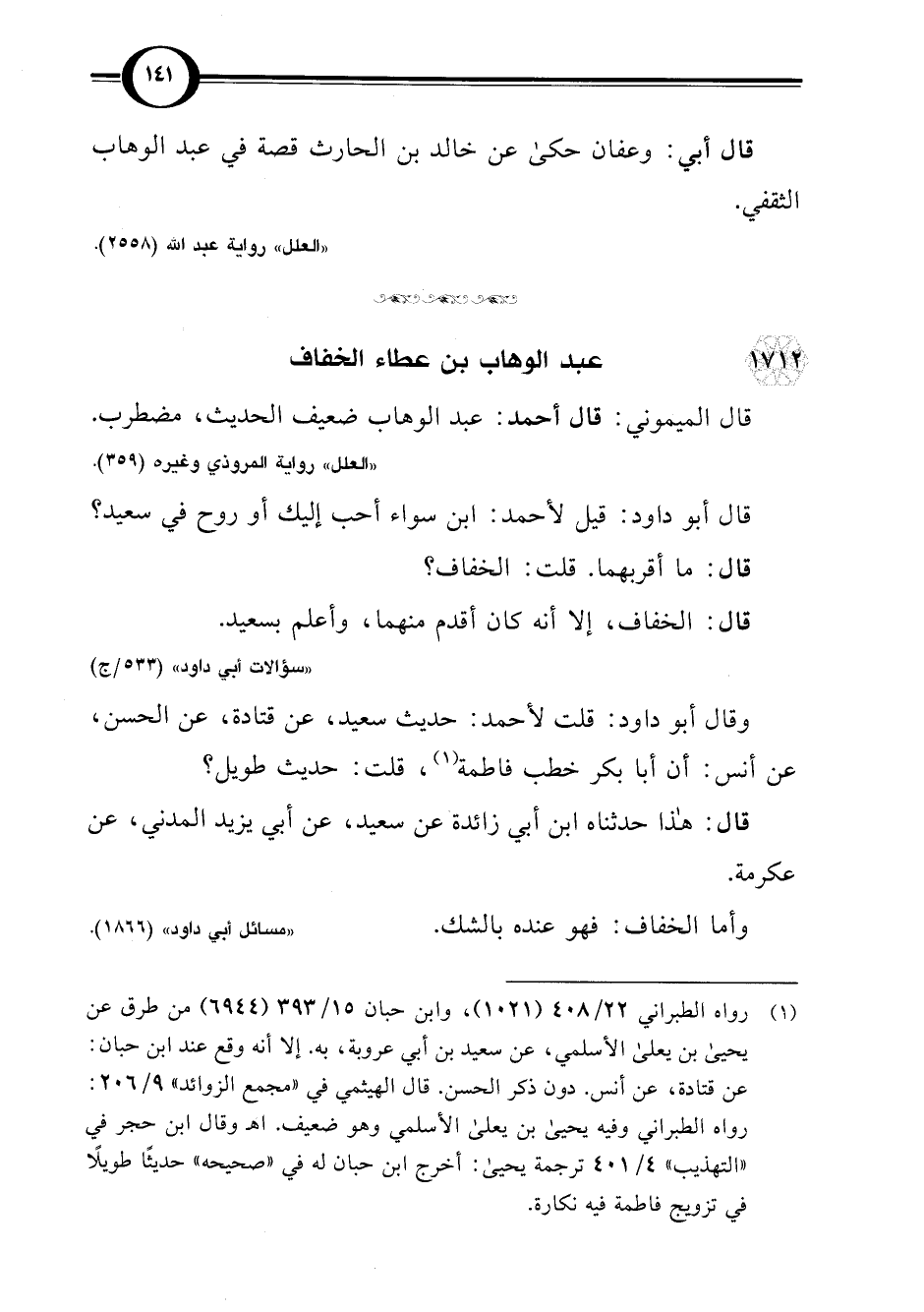 قال أبي: وعفان حكى عن خالد بن الحارث قصة في عبد الوهاب الثقفي.