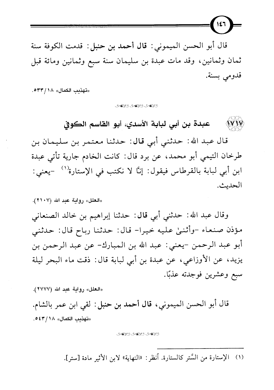 قال عبد اللَّه: حدثني أبي قال: حدثنا معتمر بن سليمان بن طرخان التيمي أبو محمد، عن برد قال: كانت الخادم جارية تأتي عبدة ابن أبي لبابة بالقرطاس فيقول: إنَّا لا نكتب في الإستارة (¬1) -يعني: الحديث.