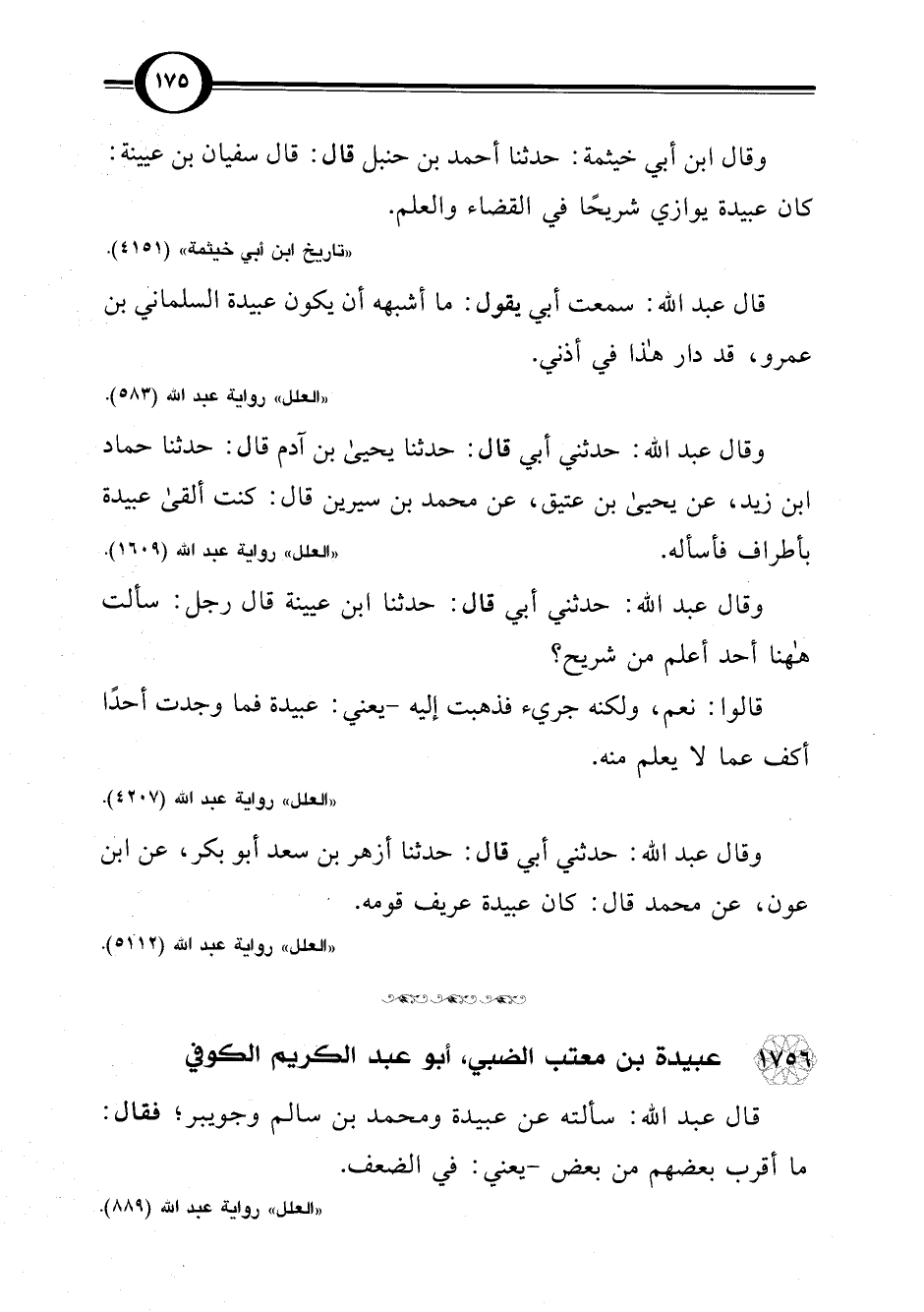 وقال عبد اللَّه: حدثني أبي قال: حدثنا يحيى بن آدم قال: حدثنا حماد ابن زيد، عن يحيى بن عتيق، عن محمد بن سيرين قال: كنت ألقى عبيدة بأطراف فأسأله.