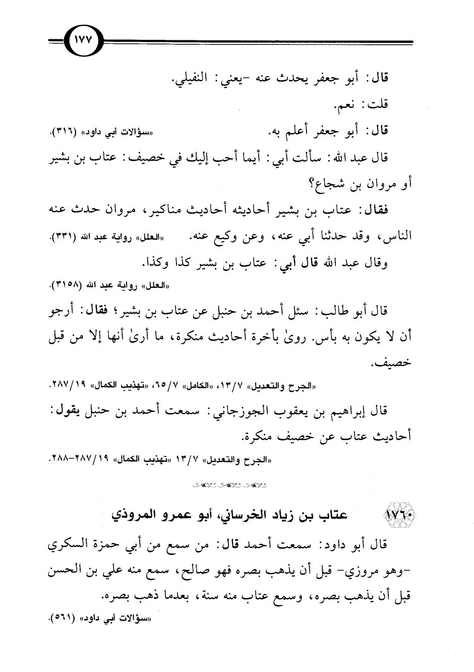 فقال: عتاب بن بشير أحاديثه أحاديث مناكير، مروان حدث عنه الناس، وقد حدثنا أبي عنه، وعن وكيع عنه.