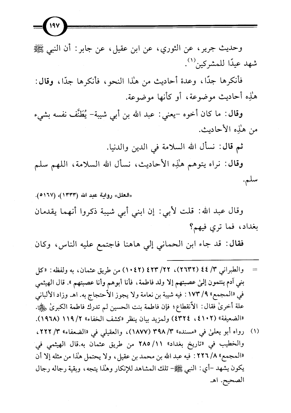 (¬1) رواه أبو يعلى في "مسنده" 3/ 398 (1877)، والعقيلي في "الضعفاء" 3/ 222، والخطيب في "تاريخ بغداد" 8/ 226 من طريق عثمان به. قال الهيثمي في "المجمع" 8/ 226: فيه عبد اللَّه بن محمد بن عقيل، ولا يحتمل هذا من مثله إلا أن يكون يشهد -أي: النبي -صلى اللَّه عليه وسلم- تلك المشاهد للإنكار وهذا يتجه، وبقية رجاله رجال الصحيح. اهـ