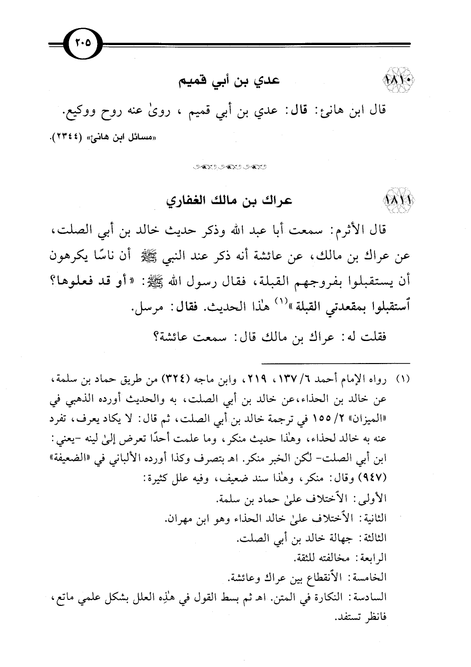 قال الأثرم: سمعت أبا عبد اللَّه وذكر حديث خالد بن أبي الصلت، عن عراك بن مالك، عن عائشة أنه ذكر عند النبي -صلى اللَّه عليه وسلم- أن ناسًا يكرهون أن يستقبلوا بفروجهم القبلة، فقال رسول اللَّه -صلى اللَّه عليه وسلم-: "أو قد فعلوها؟ استقبلوا بمقعدتي القبلة" (¬1) هذا الحديث. فقال: مرسل.