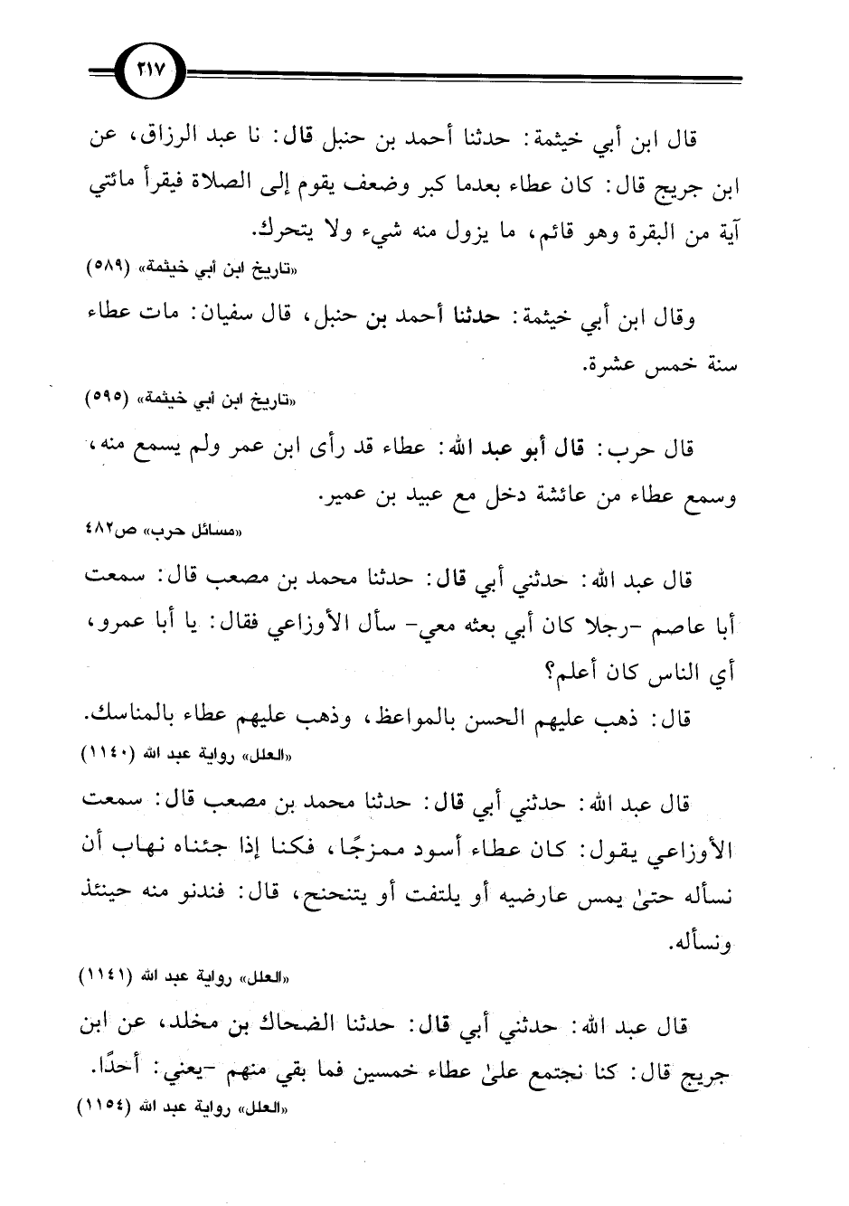 قال عبد اللَّه: حدثني أبي قال: حدثنا الضحاك بن مخلد، عن ابن جريج قال: كنا نجتمع على عطاء خمسين فما بقي منهم -يعني: أحدًا.
