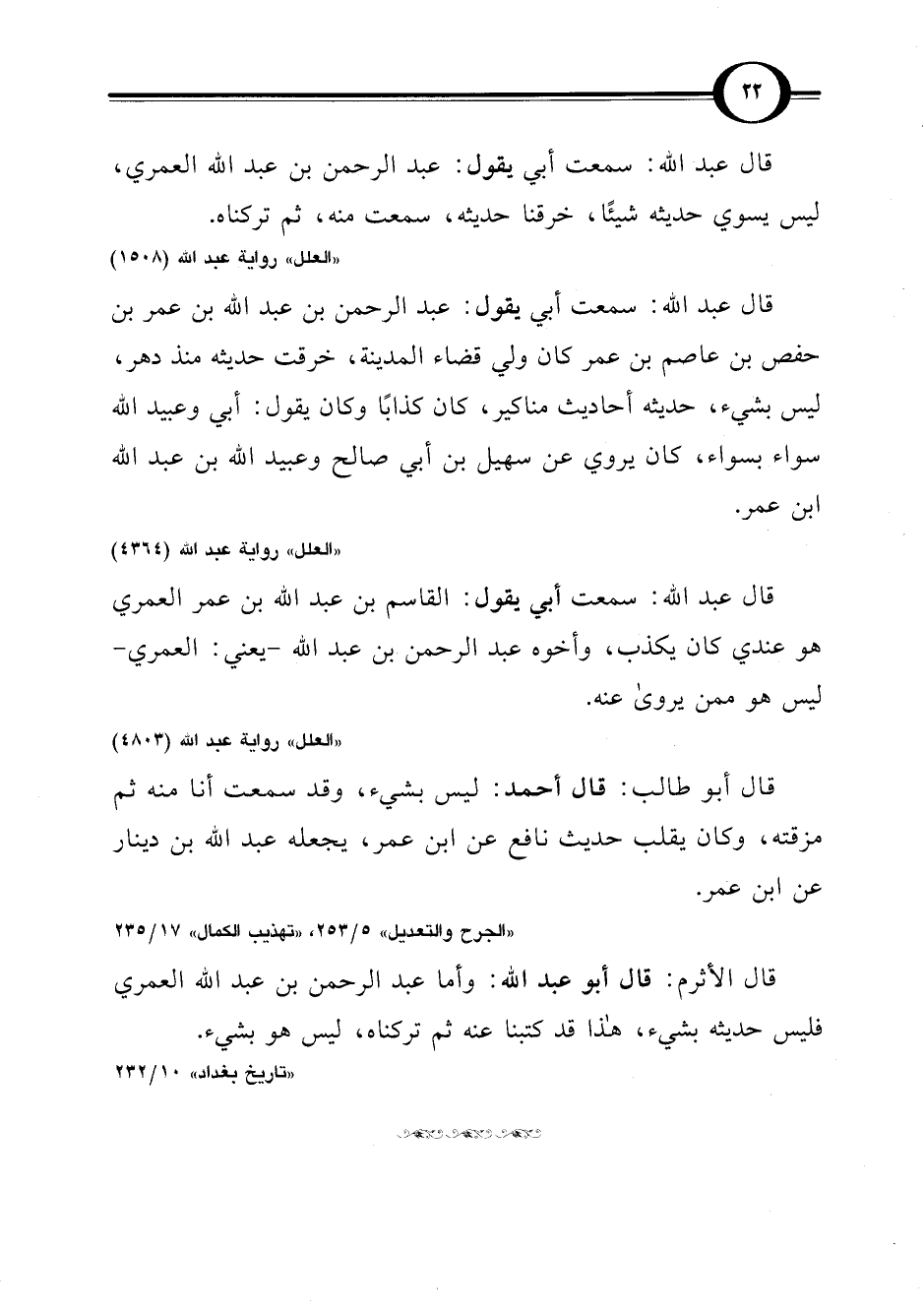 قال الأثرم: قال أبو عبد اللَّه: وأما عبد الرحمن بن عبد اللَّه العمري فليس حديثه بشيء، هذا قد كتبنا عنه ثم تركناه، ليس هو بشيء.