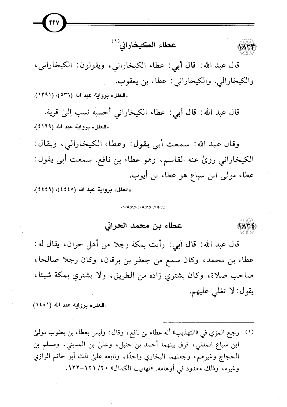وقال عبد اللَّه: سمعت أبي يقول: وعطاء الكيخارالي، ويقال: الكيخاراني روى عنه القاسم، وهو عطاء بن نافع. سمعت أبي يقول: عطاء مولى ابن سباع هو عطاء بن أيوب.