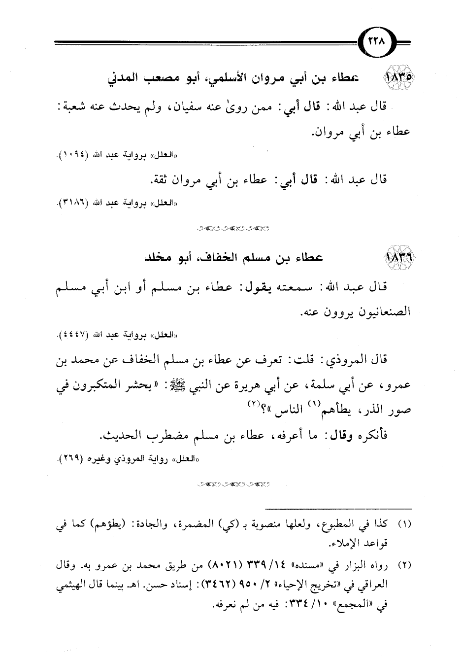 قال المروذي: قلت: تعرف عن عطاء بن مسلم الخفاف عن محمد بن عمرو، عن أبي سلمة، عن أبي هريرة عن النبي -صلى اللَّه عليه وسلم-: "يحشر المتكبرون في صور الذر، يطأهم (¬1) الناس"؟ (¬2)