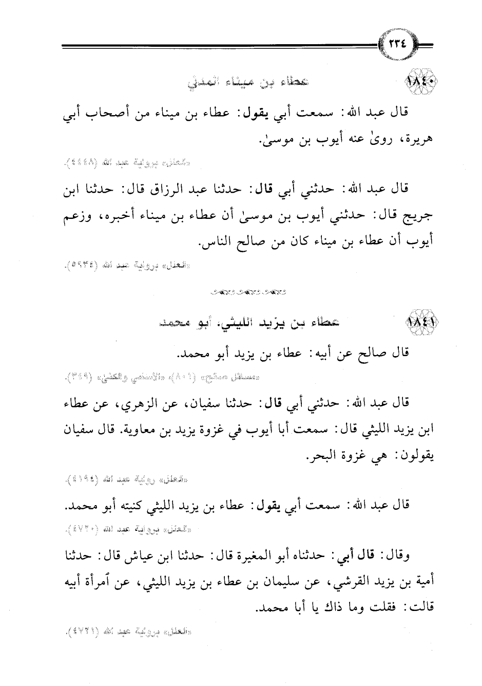 قال عبد اللَّه: سمعت أبي يقول: عطاء بن يزيد الليثي كنيته أبو محمد.
