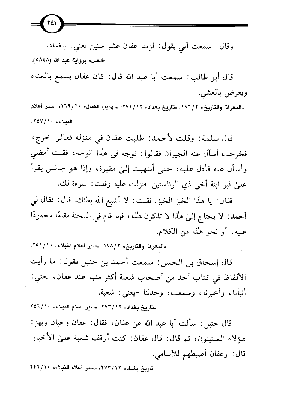 وقال: سمعت أبي يقول: لزمنا عفان عشر سنين يعني: ببغداد.