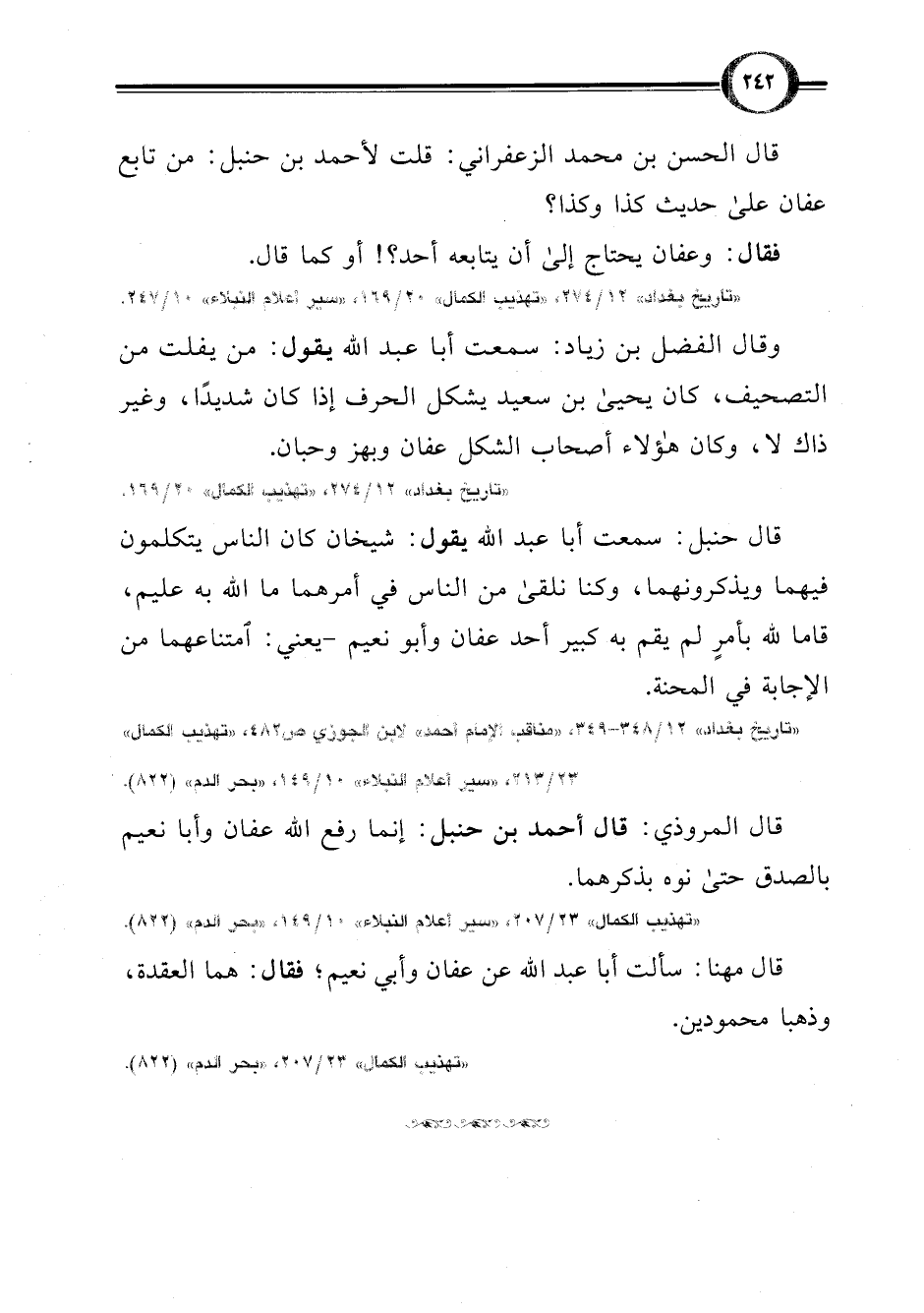 قال حنبل: سمعت أبا عبد اللَّه يقول: شيخان كان الناس يتكلمون فيهما ويذكرونهما، وكنا نلقى من الناس في أمرهما ما اللَّه به عليم، قاما للَّه بأمرٍ لم يقم به كبير أحد عفان وأبو نعيم -يعني: امتناعهما من الإجابة في المحنة.