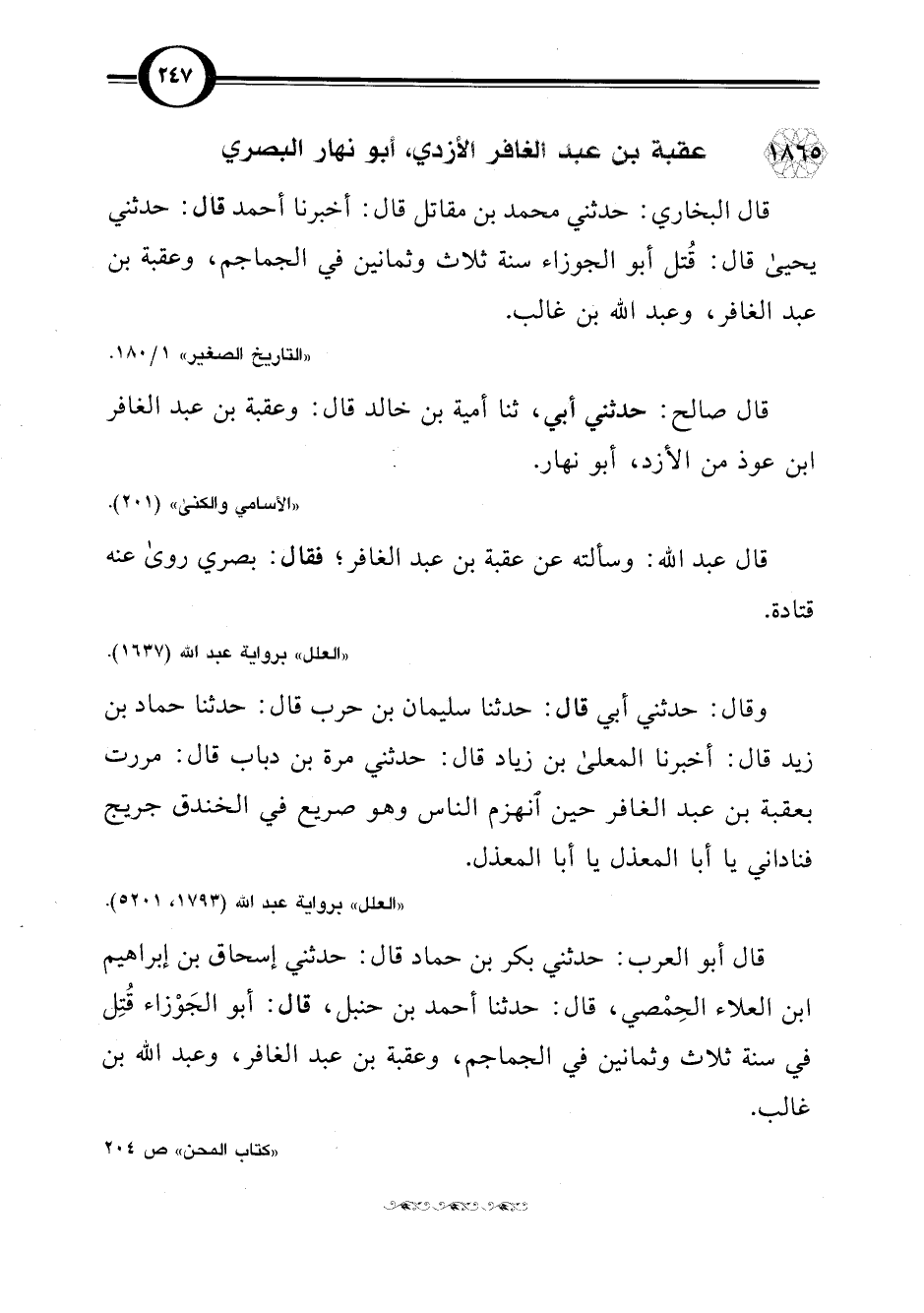 وقال: حدثني أبي قال: حدثنا سليمان بن حرب قال: حدثنا حماد بن زيد قال: أخبرنا المعلى بن زياد قال: حدثني مرة بن دباب قال: مررت بعقبة بن عبد الغافر حين انهزم الناس وهو صريع في الخندق جريج فناداني يا أبا المعذل يا أبا المعذل.