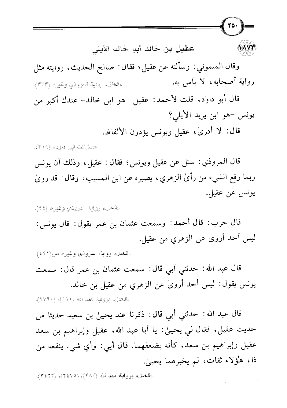قال عبد اللَّه: حدثني أبي قال: سمعت عثمان بن عمر قال: سمعت يونس يقول: ليس أحد أروى عن الزهري من عقيل بن خالد.