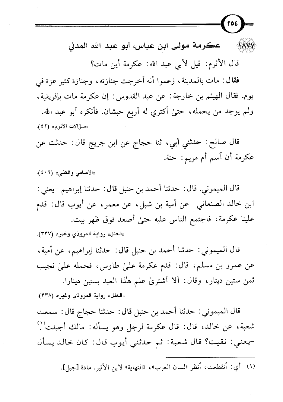 قال الميموني: حدثنا أحمد بن حنبل قال: حدثنا حجاج قال: سمعت شعبة، عن خالد، قال: قال عكرمة لرجل وهو يسأله: مالك أجبلت (¬1) -يعني: نقيت؟ قال شعبة: ثم حدثني أيوب قال: كان خالد يسأل