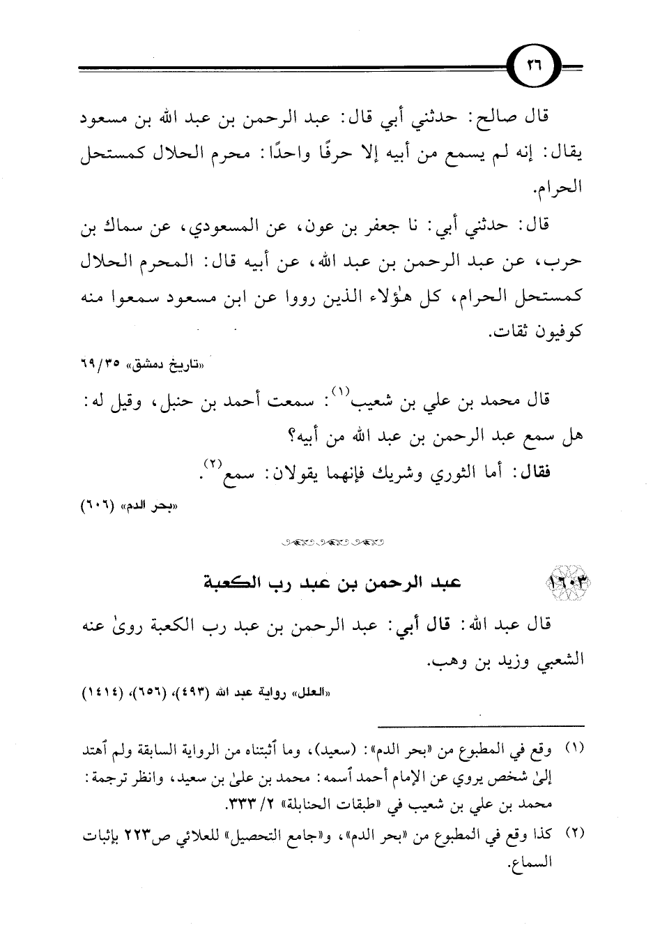 قال محمد بن علي بن شعيب (¬1): سمعت أحمد بن حنبل، وقيل له: هل سمع عبد الرحمن بن عبد اللَّه من أبيه؟
