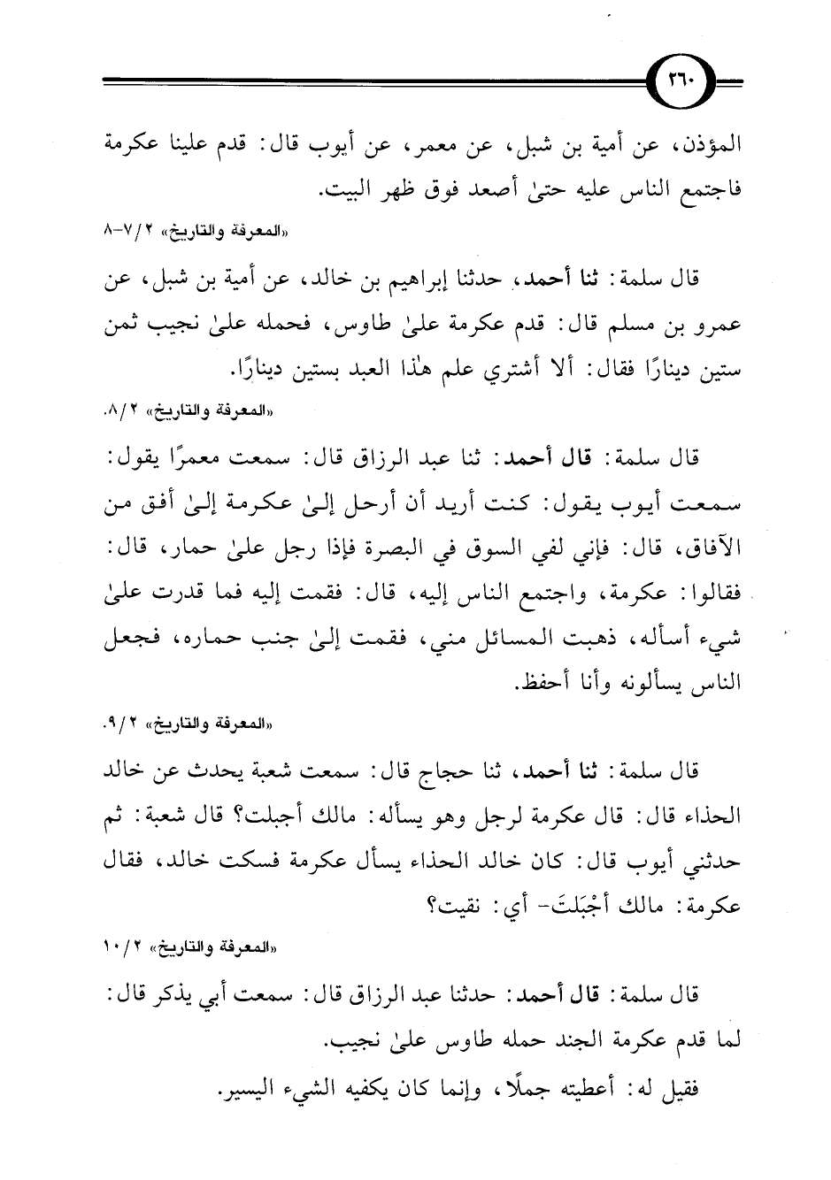 قال سلمة: ثنا أحمد، حدثنا إبراهيم بن خالد، عن أمية بن شبل، عن عمرو بن مسلم قال: قدم عكرمة على طاوس، فحمله على نجيب ثمن ستين دينارًا فقال: ألا أشتري علم هذا العبد بستين دينارًا.