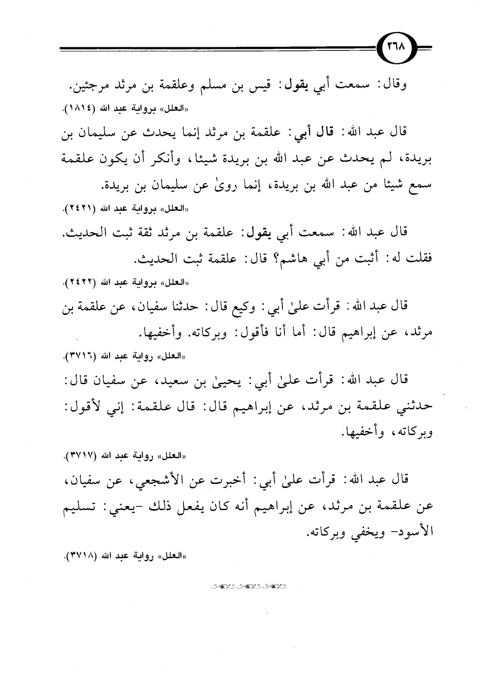قال عبد اللَّه: قرأت على أبي: يحيى بن سعيد، عن سفيان قال: حدثني علقمة بن مرثد، عن إبراهيم قال: قال علقمة: إني لأقول: وبركاته، وأخفيها.