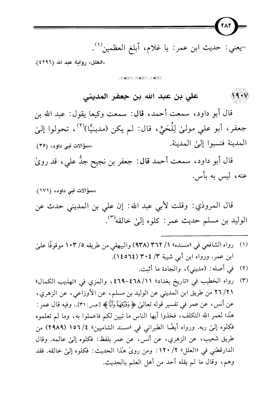 قال المروذي: وقلت لأبي عبد اللَّه: إن علي بن المديني حدث عن الوليد بن مسلم حديث عمر: كلوه إلى خالقه (¬3).