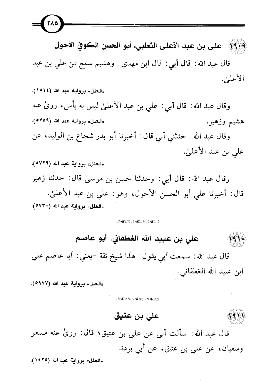 وقال عبد اللَّه: حدثني أبي قال: أخبرنا أبو بدر شجاع بن الوليد، عن علي بن عبد الأعلى.