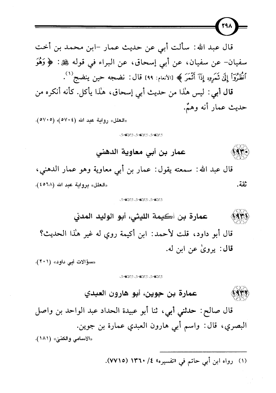 قال عبد اللَّه: سألت أبي عن حديث عمار -ابن محمد بن أخت سفيان- عن سفيان، عن أبي إسحاق، عن البراء في قوله عز وجل: {انْظُرُوا إِلَى ثَمَرِهِ إِذَا أَثْمَرَ} [الأنعام: 99] قال: نضجه حين ينضج (¬1).