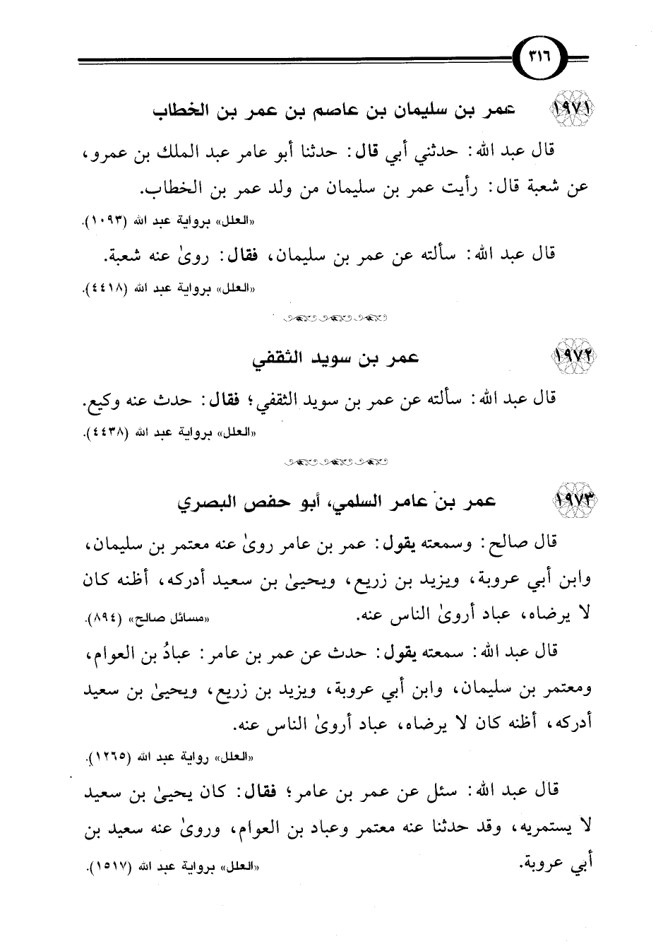 قال عبد اللَّه: حدثني أبي قال: حدثنا أبو عامر عبد الملك بن عمرو، عن شعبة قال: رأيت عمر بن سليمان من ولد عمر بن الخطاب.