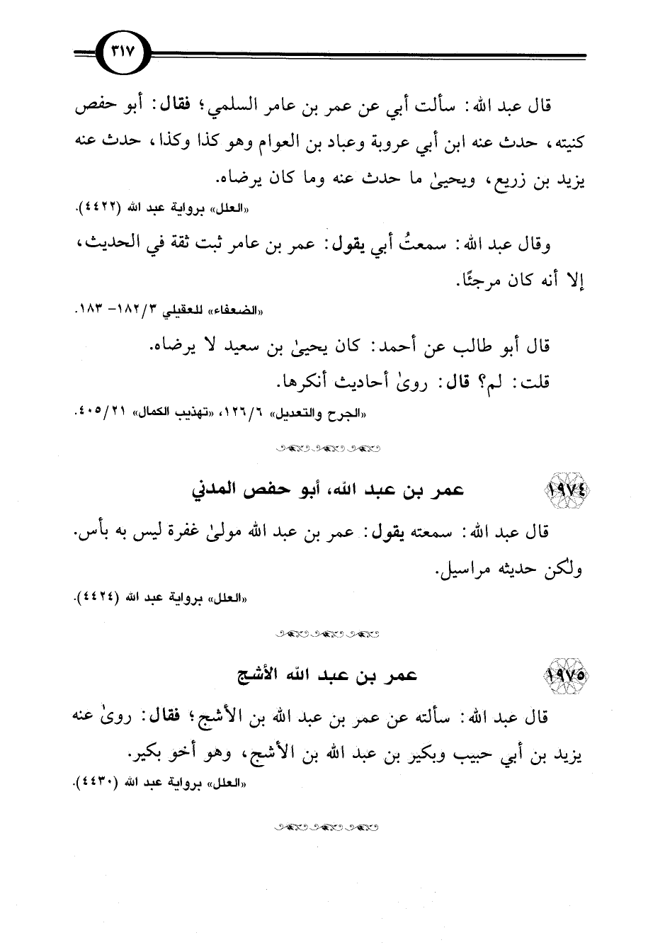 قال عبد اللَّه: سألت أبي عن عمر بن عامر السلمي؛ فقال: أبو حفص كنيته، حدث عنه ابن أبي عروبة وعباد بن العوام وهو كذا وكذا، حدث عنه يزيد بن زريع، ويحيى ما حدث عنه وما كان يرضاه.