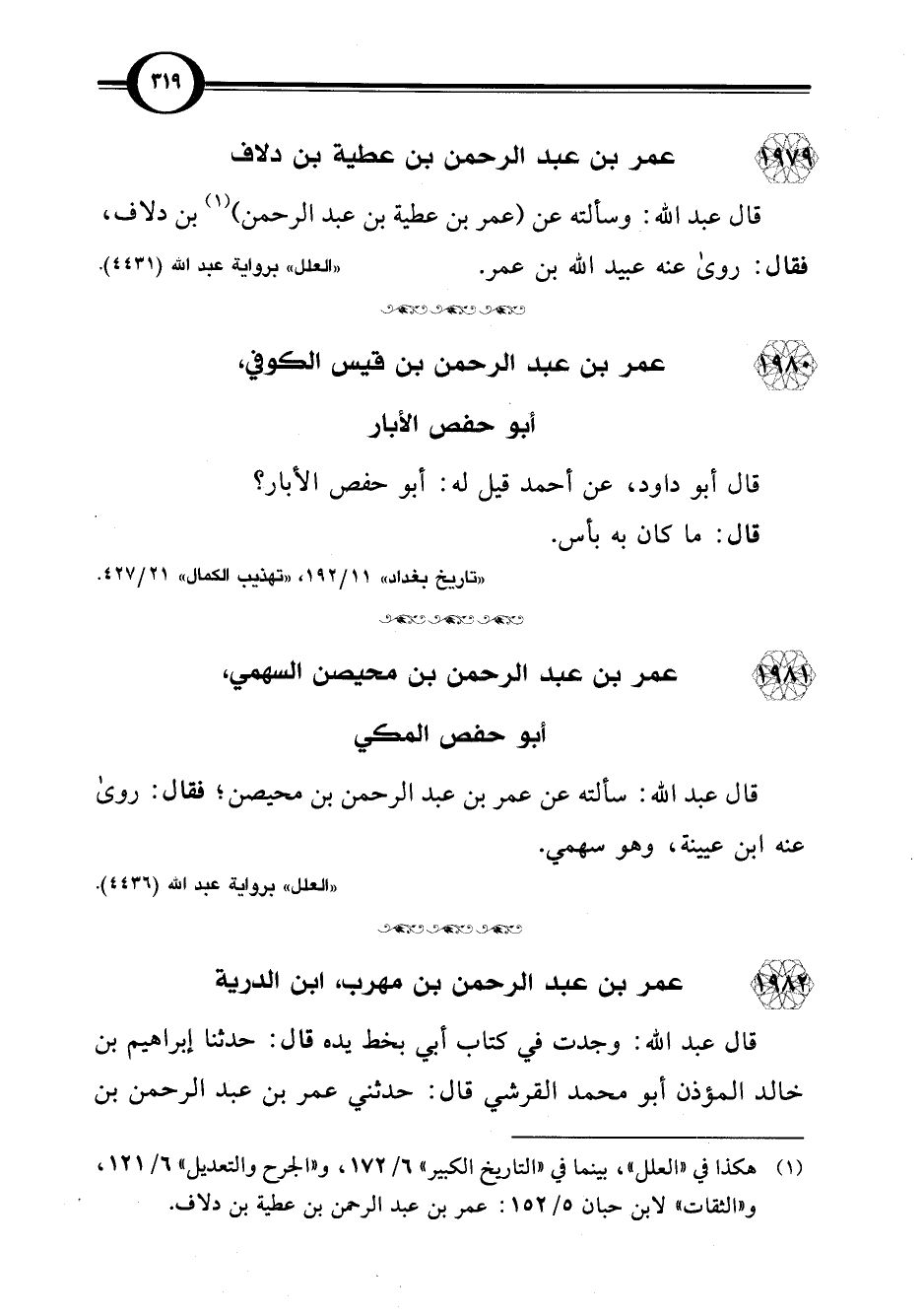 (¬1) هكذا في "العلل"، بينما في "التاريخ الكبير" 6/ 172، و"الجرح والتعديل" 6/ 121، و"الثقات" لابن حبان 5/ 152: عمر بن عبد الرحمن بن عطية بن دلاف.