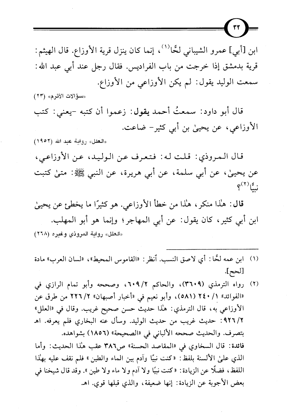 قال المروذي: قلت له: فتعرف عن الوليد، عن الأوزاعي، عن يحيى، عن أبي سلمة، عن أبي هريرة، عن النبي -صلى اللَّه عليه وسلم-: متى كتبت نبيًّا (¬2)؟