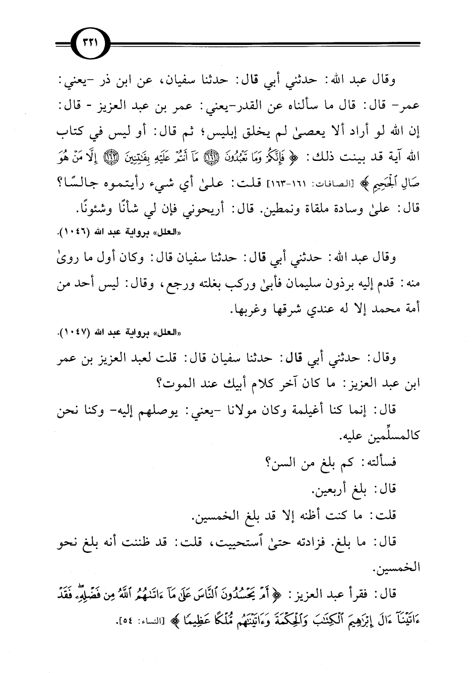 وقال عبد اللَّه: حدثني أبي قال: حدثنا سفيان، عن ابن ذر -يعني: عمر- قال: قال ما سألناه عن القدر -يعني: عمر بن عبد العزيز- قال: إن اللَّه لو أراد ألا يعصى لم يخلق إبليس؛ ثم قال: أو ليس في كتاب اللَّه آية قد بينت ذلك: {فَإِنَّكُمْ وَمَا تَعْبُدُونَ (161) مَا أَنْتُمْ عَلَيْهِ بِفَاتِنِينَ (162) إِلَّا مَنْ هُوَ صَالِ الْجَحِيمِ} [الصافات: 161 - 163] قلت: على أي شيء رأيتموه جالسًا؟ قال: على وسادة ملقاة ونمطين. قال: أريحوني فإن لي شأنًا وشئونًا.