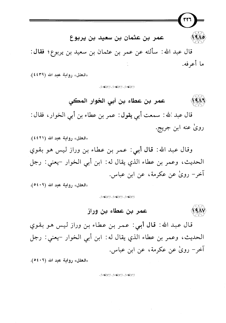 قال عبد اللَّه: قال أبي: عمر بن عطاء بن وراز ليس هو بقوى الحديث، وعمر بن عطاء الذي يقال له: ابن أبي الخوار -يعني: رجل آخر- روى عن عكرمة، عن ابن عباس.