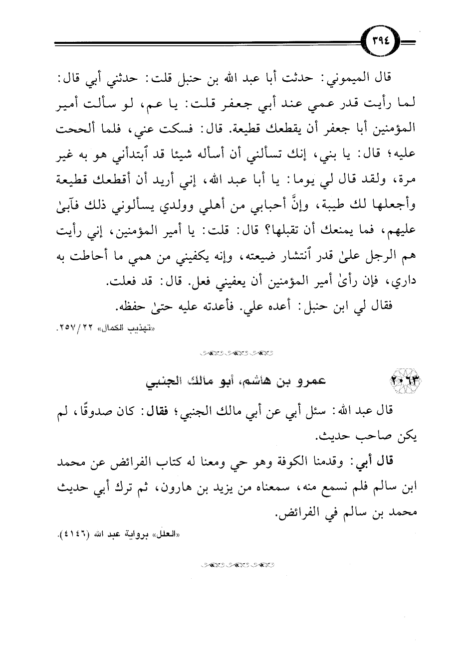 قال الميموني: حدثت أبا عبد اللَّه بن حنبل قلت: حدثني أبي قال: لما رأيت قدر عمي عند أبي جعفر قلت: يا عم، لو سألت أمير المؤمنين أبا جعفر أن يقطعك قطيعة. قال: فسكت عني، فلما ألححت عليه؛ قال: يا بني، إنك تسألني أن أسأله شيئًا قد ابتدأني هو به غير مرة، ولقد قال لي يومًا: يا أبا عبد اللَّه، إني أريد أن أقطعك قطيعة وأجعلها لك طيبة، وإنَّ أحبابي من أهلي وولدي يسألوني ذلك فآبى عليهم، فما يمنعك أن تقبلها؟ قال: قلت: يا أمير المؤمنين، إني رأيت هم الرجل على قدر انتشار ضيعته، وإنه يكفيني من همي ما أحاطت به داري، فإن رأى أمير المؤمنين أن يعفيني فعل. قال: قد فعلت.