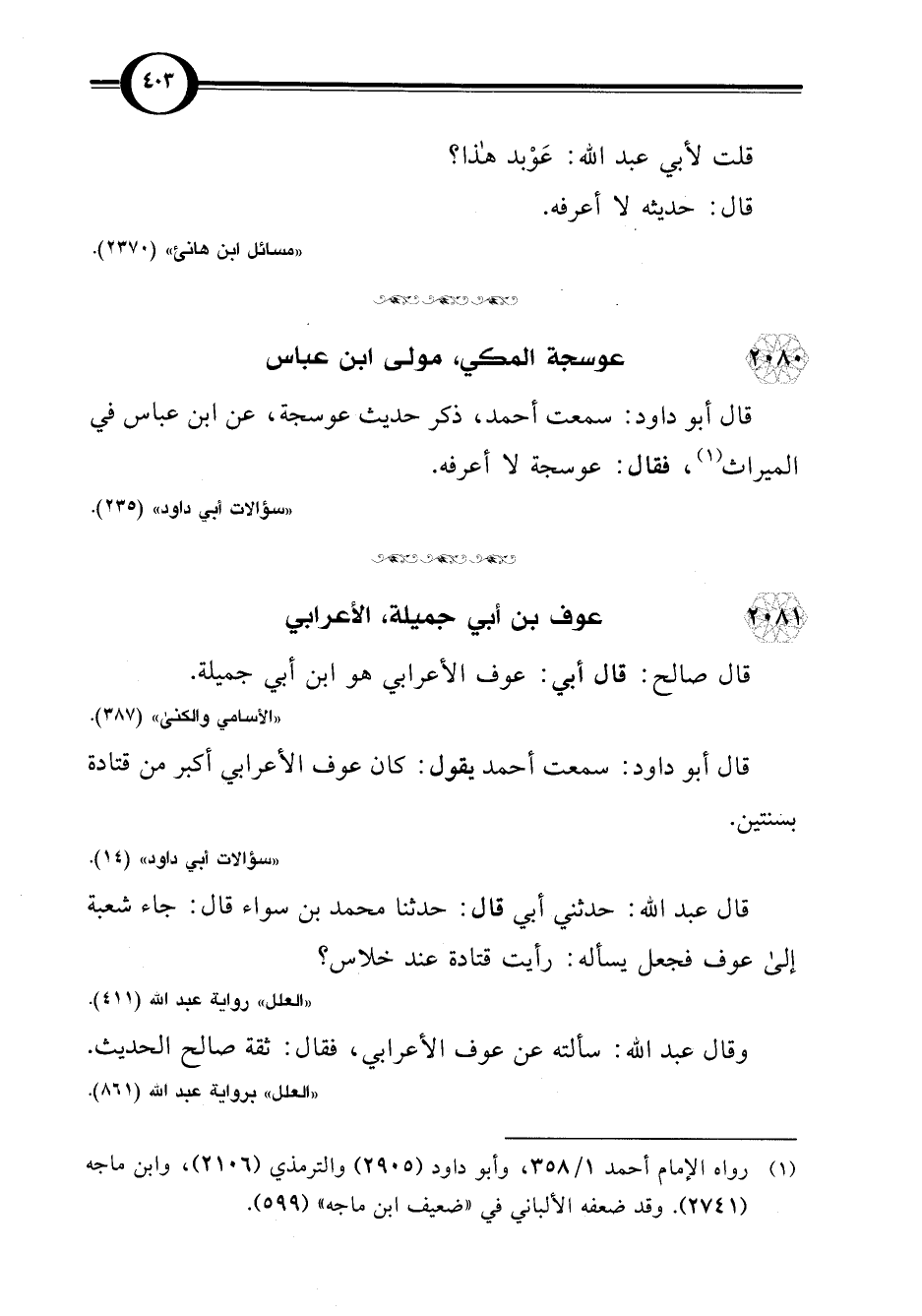 قال أبو داود: سمعت أحمد، ذكر حديث عوسجة، عن ابن عباس في الميراث (¬1)، فقال: عوسجة لا أعرفه.