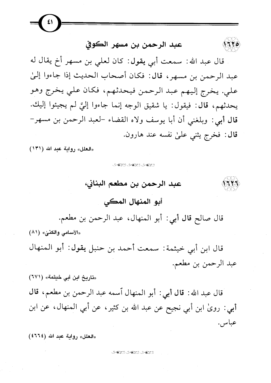 قال عبد اللَّه: قال أبي: أبو المنهال اسمه عبد الرحمن بن مطعم، قال أبي: روى ابن أبي نجيح عن عبد اللَّه بن كثير، عن أبي المنهال، عن ابن عباس.