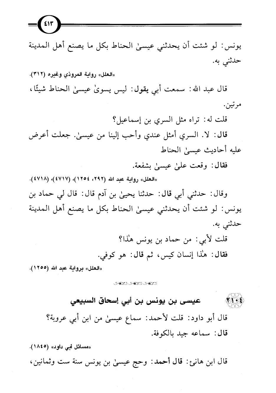 قال: لا. السري أمثل عندي وأحب إلينا من عيسى. جعلت أعرض عليه أحاديث عيسى الحناط