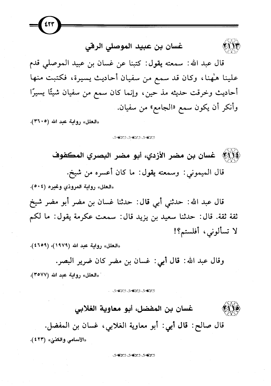قال عبد اللَّه: سمعته يقول: كتبنا عن غسان بن عبيد الموصلي قدم علينا ههنا، وكان قد سمع من سفيان أحاديث يسيرة، فكتبت منها أحاديث وخرقت حديثه مذ حين، وإنما كان سمع من سفيان شيئًا يسيرًا وأنكر أن يكون سمع "الجامع" من سفيان.