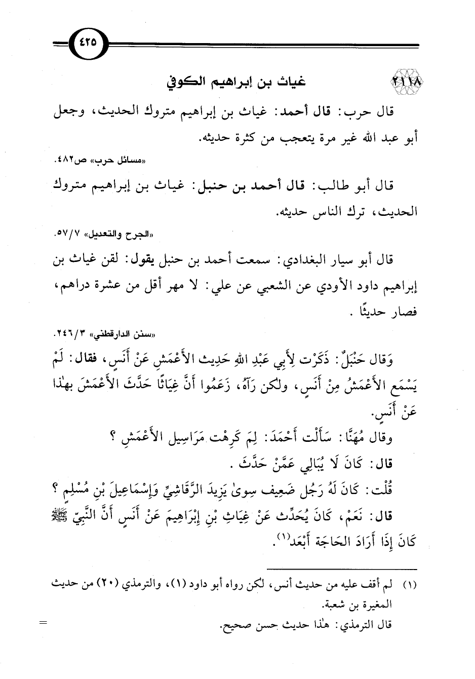 قال أبو طالب: قال أحمد بن حنبل: غياث بن إبراهيم متروك الحديث، ترك الناس حديثه.