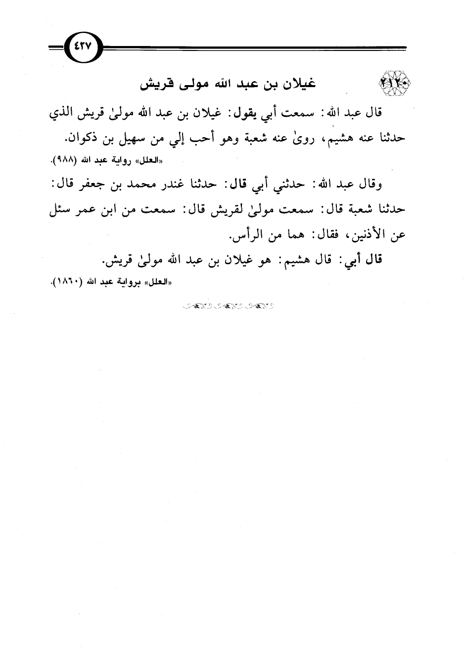 وقال عبد اللَّه: حدثني أبي قال: حدثنا غندر محمد بن جعفر قال: حدثنا شعبة قال: سمعت مولى لقريش قال: سمعت من ابن عمر سئل عن الأذنين، فقال: هما من الرأس.