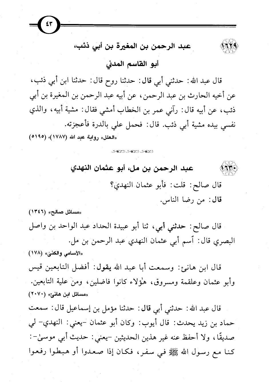 قال عبد اللَّه: حدثني أبي قال: حدثنا مؤمل بن إسماعيل قال: سمعت حماد بن زيد يحدث: قال أيوب: وكان أبو عثمان -يعني: النهدي- لي صديقًا, ولا أحفظ عنه غير هذين الحديثين -يعني: حديث أبي موسى-: كنا مع رسول اللَّه -صلى اللَّه عليه وسلم- في سفر، فكان إذا صعدوا أو هبطوا رفعوا