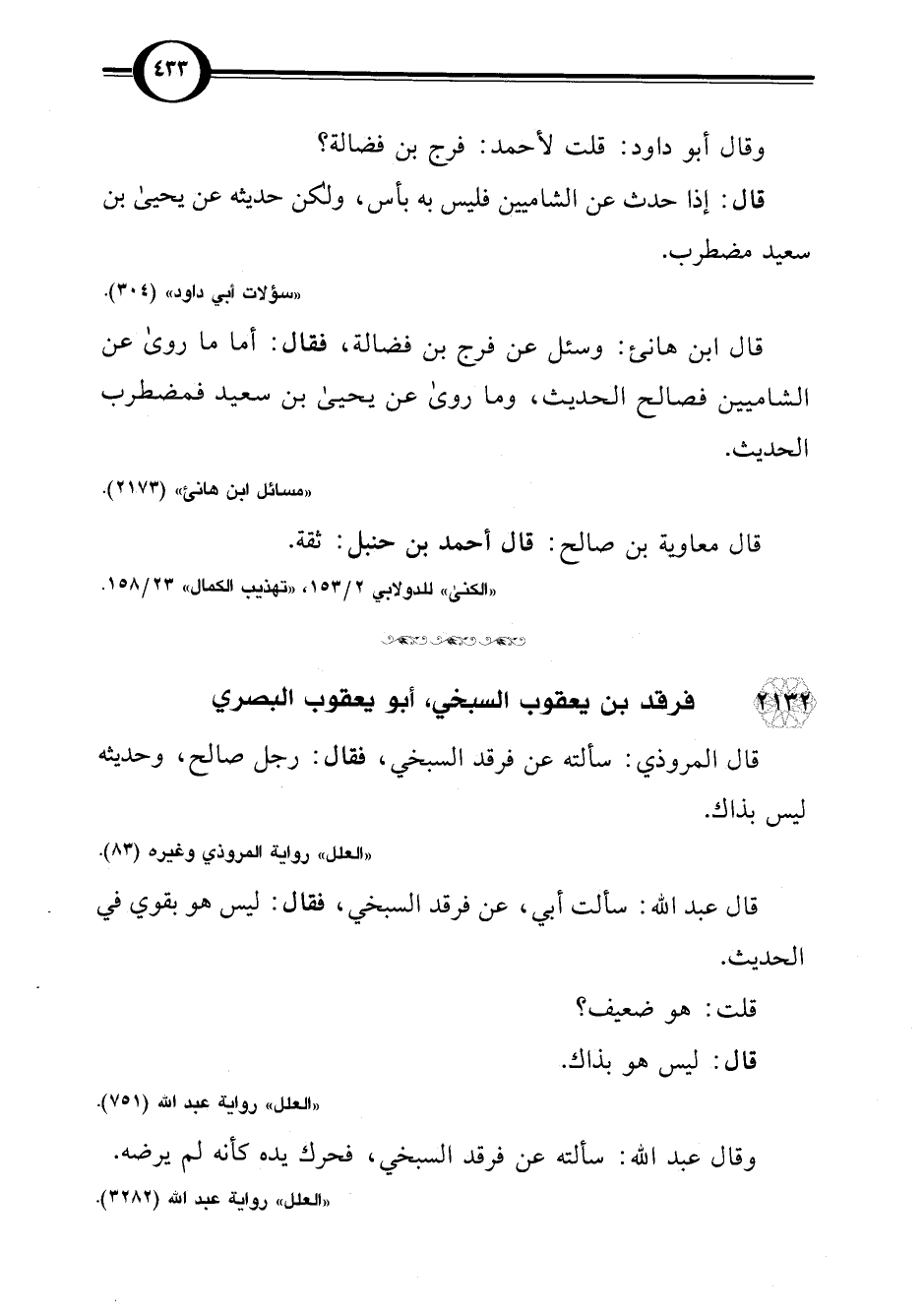 قال ابن هانئ: وسئل عن فرج بن فضالة، فقال: أما ما روى عن الشاميين فصالح الحديث، وما روى عن يحيى بن سعيد فمضطرب الحديث.