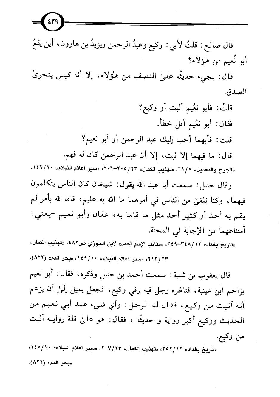 قال صالح: قلتُ لأبي: وكيع وعبدُ الرحمن ويزيدُ بن هارون، أين يقعُ أبو نُعيم من هؤلاء؟