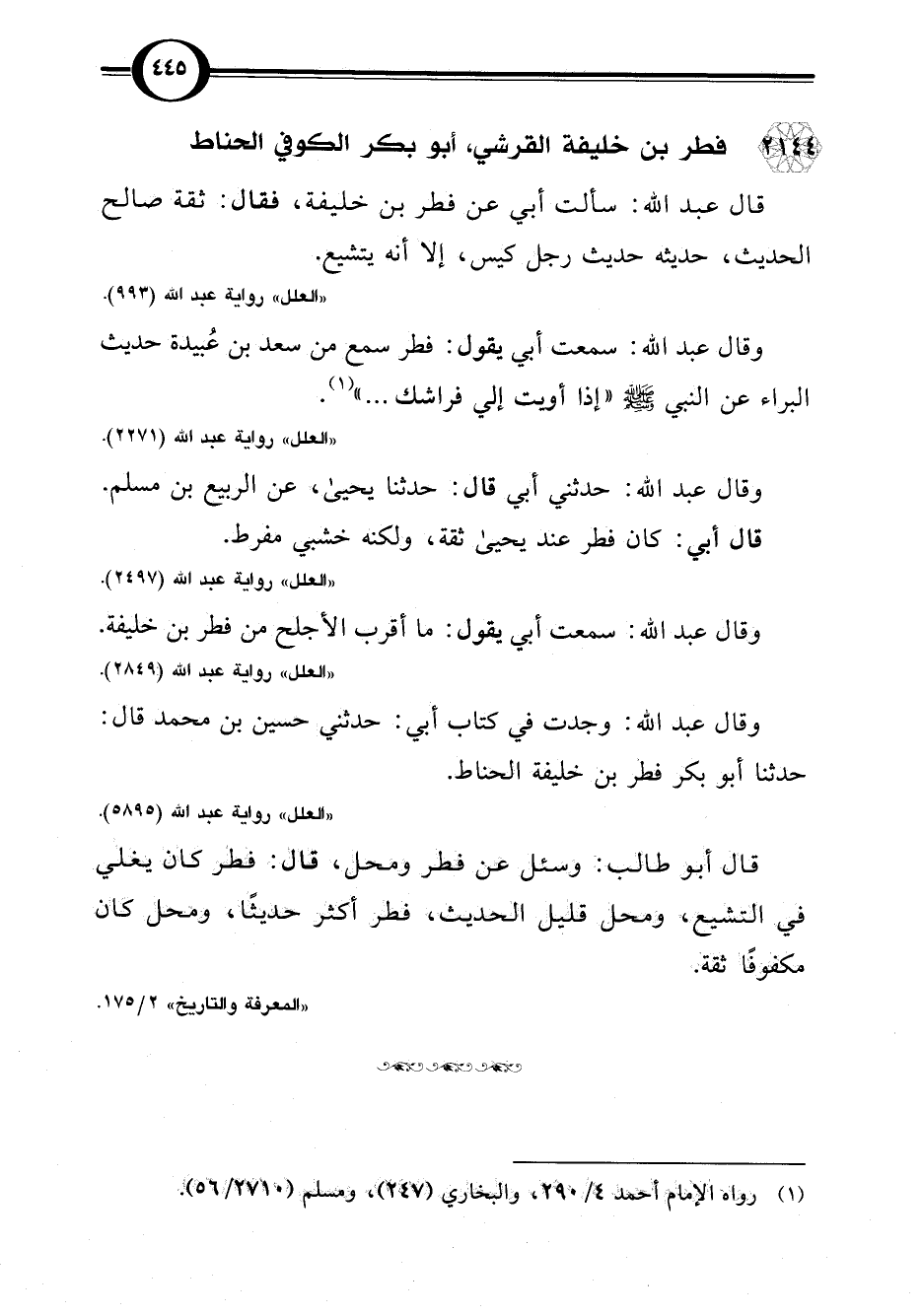 وقال عبد اللَّه: وجدت في كتاب أبي: حدثني حسين بن محمد قال: حدثنا أبو بكر فطر بن خليفة الحناط.