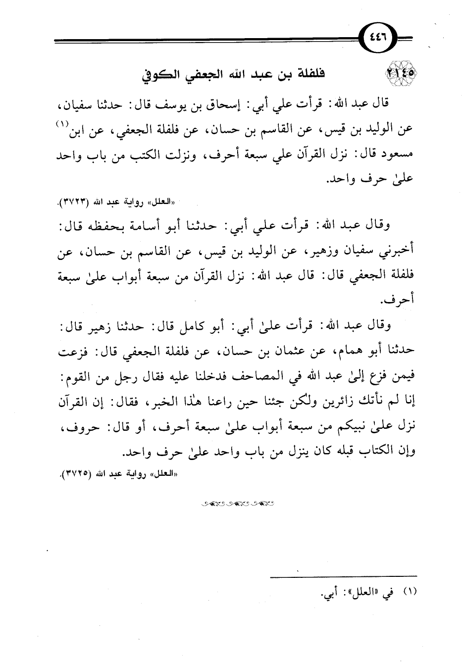 وقال عبد اللَّه: قرأت على أبي: حدثنا أبو أسامة بحفظه قال: أخبرني سفيان وزهير، عن الوليد بن قيس، عن القاسم بن حسان، عن فلفلة الجعفي قال: قال عبد اللَّه: نزل القرآن من سبعة أبواب على سبعة أحرف.