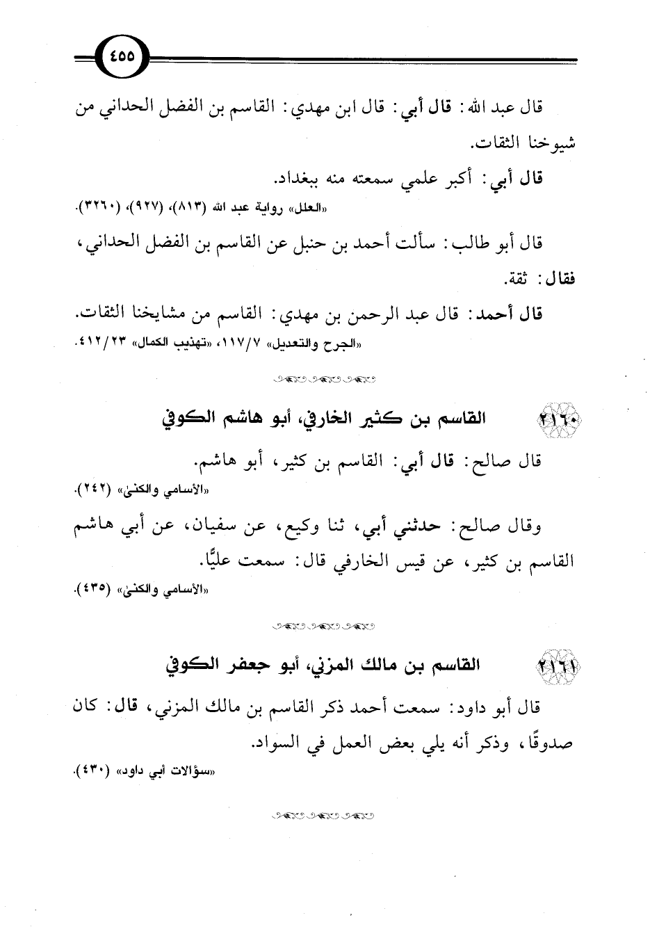 قال أحمد: قال عبد الرحمن بن مهدي: القاسم من مشايخنا الثقات.
