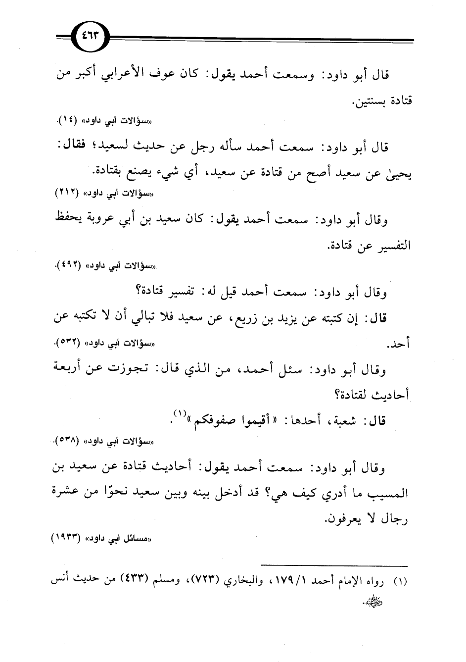 وقال أبو داود: سمعت أحمد يقول: كان سعيد بن أبي عروبة يحفظ التفسير عن قتادة.