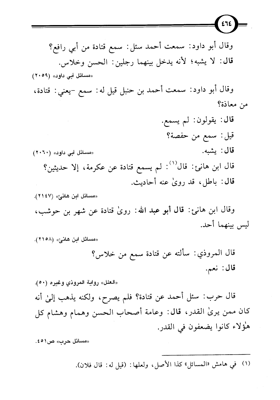 قال حرب: سئل أحمد عن قتادة؟ فلم يصرح، ولكنه يذهب إلى أنه كان ممن يرى القدر، قال: وعامة أصحاب الحسن وهمام وهشام كل هؤلاء كانوا يضعفون في القدر.