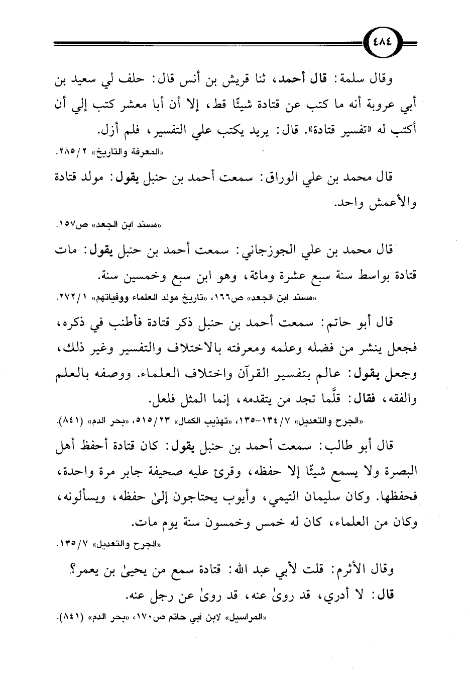 وقال سلمة: قال أحمد، ثنا قريش بن أنس قال: حلف لي سعيد بن أبي عروبة أنه ما كتب عن قتادة شيئًا قط، إلا أن أبا معشر كتب إلى أن أكتب له "تفسير قتادة". قال: يريد يكتب على التفسير، فلم أزل.