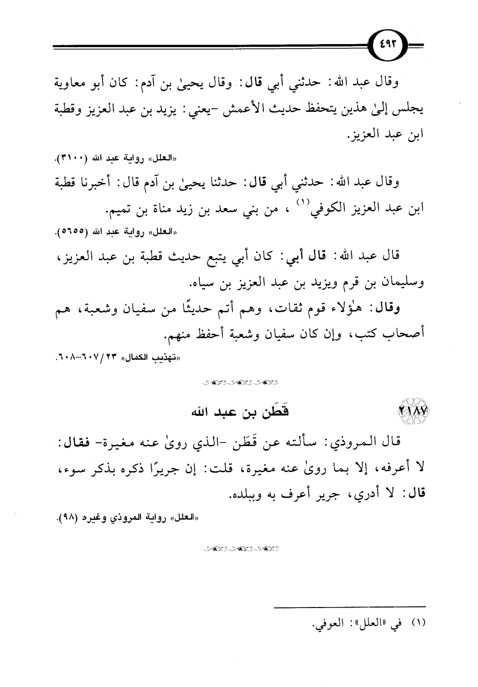 وقال عبد اللَّه: حدثني أبي قال: حدثنا يحيى بن آدم قال: أخبرنا قطبة ابن عبد العزيز الكوفي (¬1)، من بني سعد بن زيد مناة بن تميم.