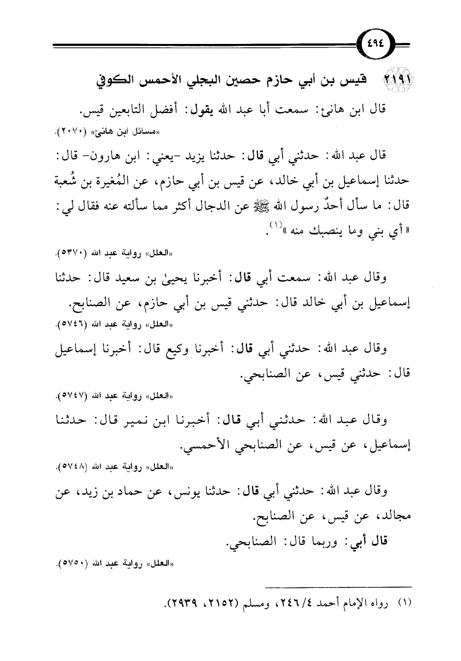 وقال عبد اللَّه: سمعت أبي قال: أخبرنا يحيى بن سعيد قال: حدثنا إسماعيل بن أبي خالد قال: حدثني قيس بن أبي حازم، عن الصنابح.